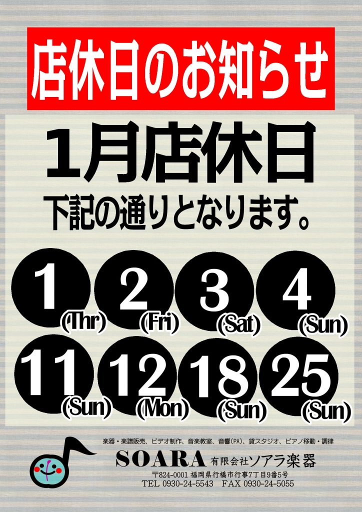 1月1日、2日、3日、4日、11日、12日、18日、25日は店舗休業日とさせていただきます。