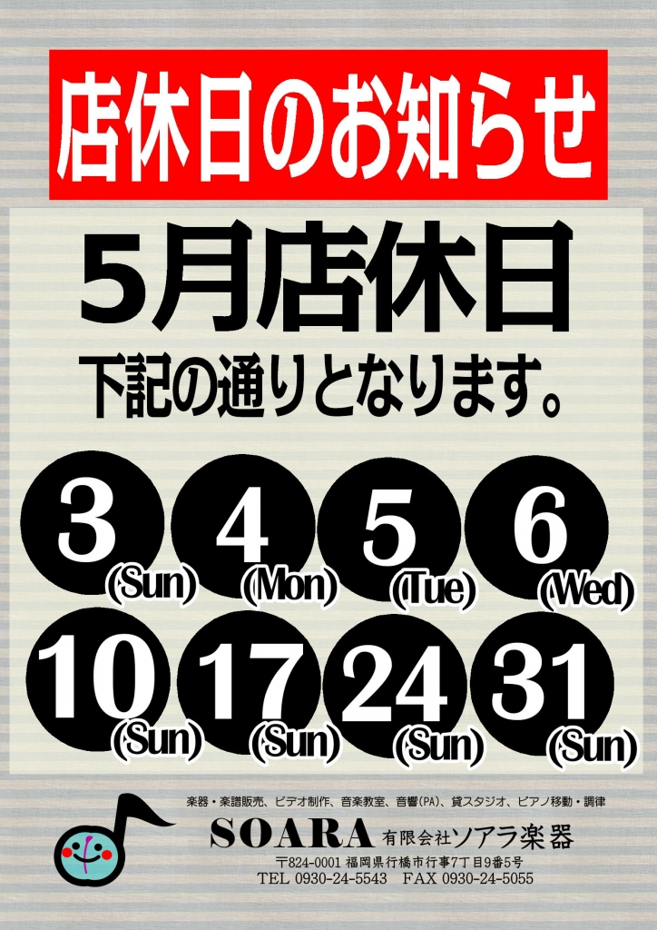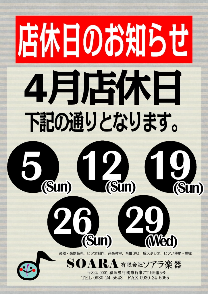 4月5日、12日、19日、26日、29日は店舗休業日とさせていただきます。